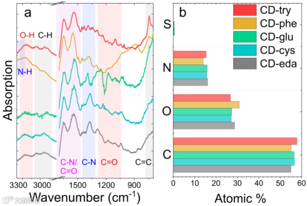 图3:五种 CD 样品的化学组分:CD eda(灰色)、CD-cys(青色)、CD-glu(绿色)、CD-phe(橙色)、CD-try(红色)。(a)对应于不同化学键的特征峰的傅里叶变换红外光谱,以不同颜色突出显示;(b)从 XPS 测量得出的 CD 的不同化学元素(C、O、N、S)的原子百分比。