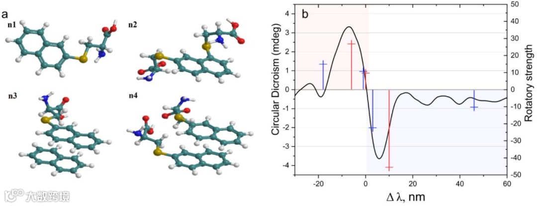 图6:(a) 具有一个(n1)或两个(n2)L-半胱氨酸分子的萘酚分子和一个(n3)或两个(n4)L-半胱氨酸分子的萘酚二聚体分子的手性光学中心示意图。这四个模型被用于阐述 CD-cys 在 300nm 到 400nm 波长区域中可能存在的手性特征。(b)计算得到的 n3(红色十字)和 n4(蓝色十字)的旋转强度,以及测量得到的 CD-cys 圆二色光谱,关于 n3,n4 以及 CD-cys 在 309 nm,318 nm 和 340 nm 处的最大吸收带的相对值的比较。红色和蓝色区域分别表示了正二级和负一级 Cotton 效应。