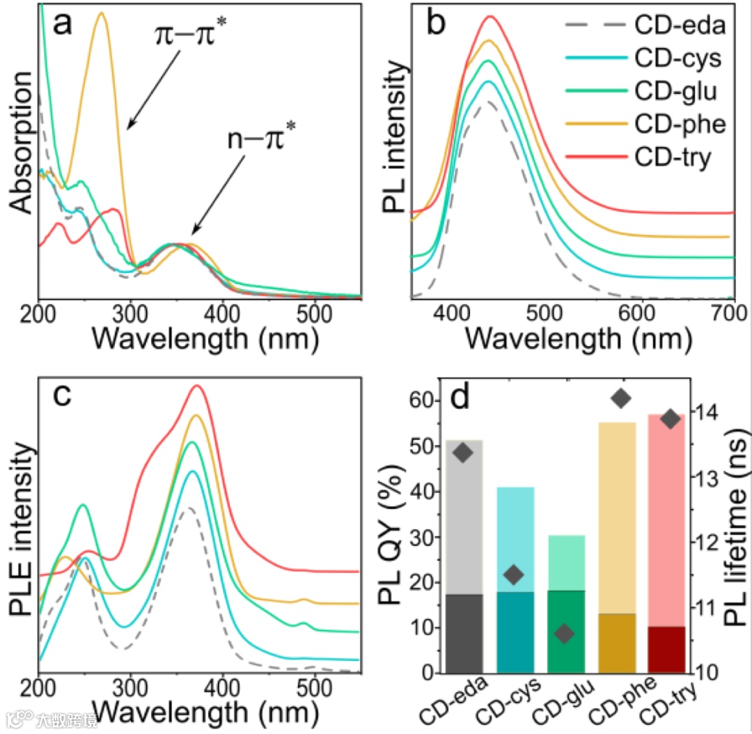 图4:五种 CD 样品的光学特性:CD-eda(灰色)、CD-cys(青色)、CD-glu(绿色)、CD-phe(橙色)、CD-try(红色)。(a)吸收光谱;(b)归一化光致发光(photoluminescence,PL)光谱,激发波长为 350 nm;(c)归一化 光致发光激发(photoluminescence excitation,PLE)光谱;(d)准备好的(浅色)和紫外线暴露(深色)CD 的 PLQY(条),以及它们在水中的平均 PL寿命(菱形符号)。CD 在紫外线下(λ=366 nm)照射 420分钟。