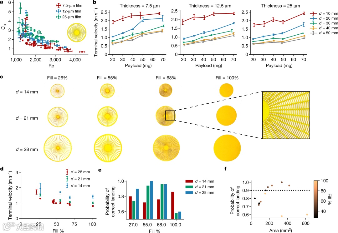 ● 本文系统地测量了75种设计(三种材料,7-25.4μm,5种直径10-50mm,5种有效载荷,20-70mg)从2m高度坠落时的末端速度。由于精确模拟薄、变形、自由落体物体的流固相互作用的复杂性,本文进行了经验测量。结果表明,Cd随着雷诺数Re的减小而增加(图2a);这与自然羽化种子和流动中的所有物体(例如球体、圆柱体)的趋势相似。本文注意到Cd最高的点是最小和最轻的,这为小型化提供了理论参考。