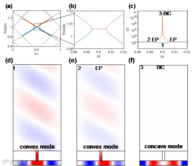 进一步对弱耦合情况下模式交叉区域的能带进行分析发现(图4),本征频率实部在布里渊边界附近简并,但虚部劈裂,其中一个模式(1)Q值有限,另一个模式(3)Q值发散,为BIC态。偏离布里渊区边界