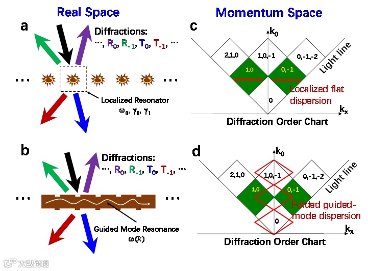 图1. 局域模(a, c)与非局域模(b, d)对超构光栅的衍射级管理。(a,b)为实空间示意图,(c,d)为倒空间示意图。