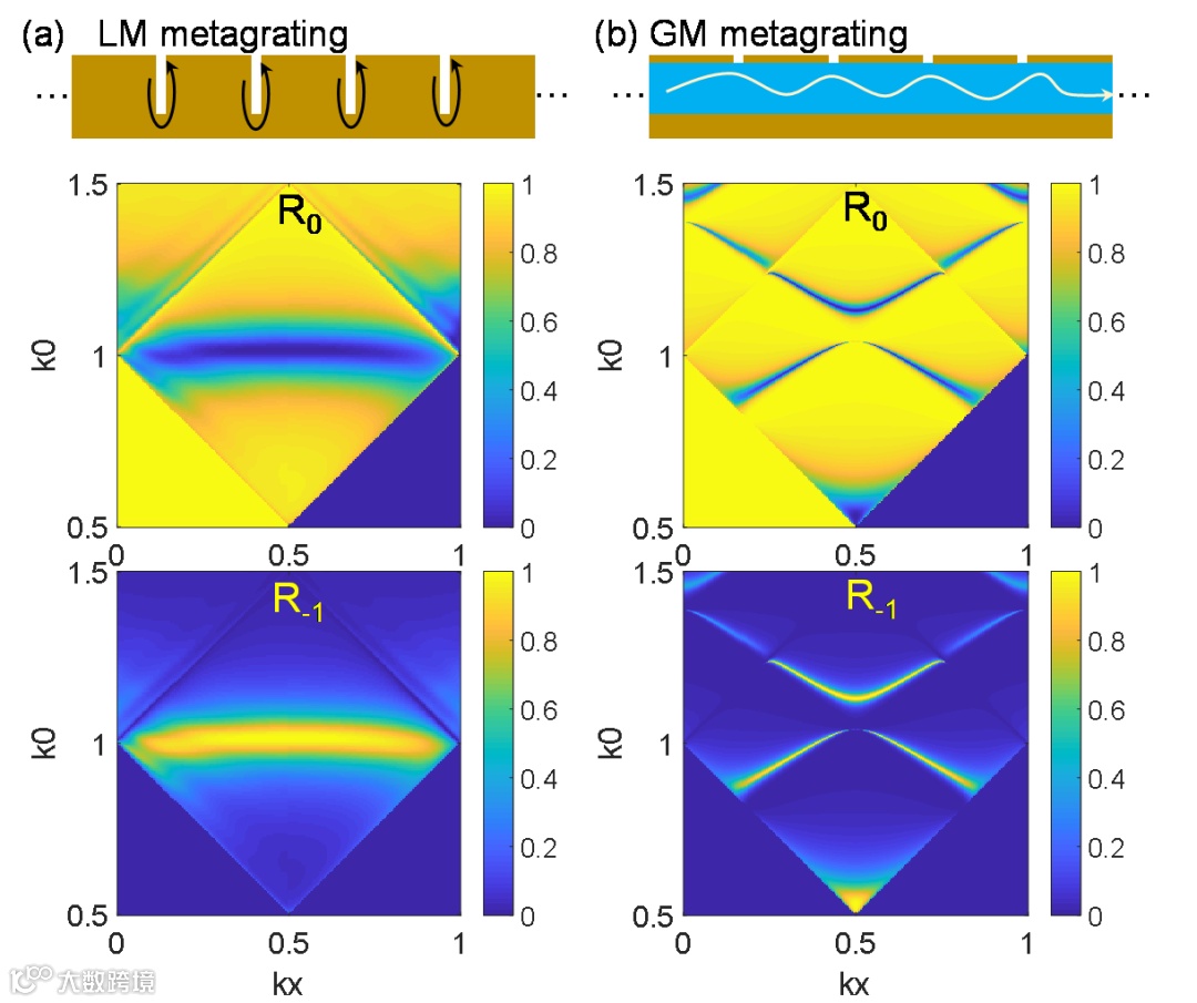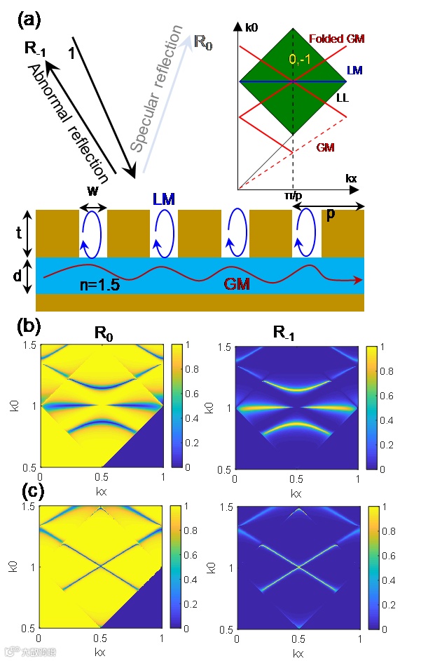 局域模式对超构光栅衍射级的调制效果如图2(a)所示,金属狭缝的间隙模式共振诱导了0级衍射谷与-1级完美衍射峰(异常反射),由于间隙模式的局域性,其共振波长不随入射角度(或平行波矢kx)变化,表现为无角度色散的平带;非局域模式对超构光栅衍射级的调制效果如图2(b)所示,前向与后向的Bloch模式耦合,在布里渊边界处出现反交叉的形态,导波模式的色散曲线映射到0及衍射谷、与-1级完美衍射峰(异常反射)轨迹上。