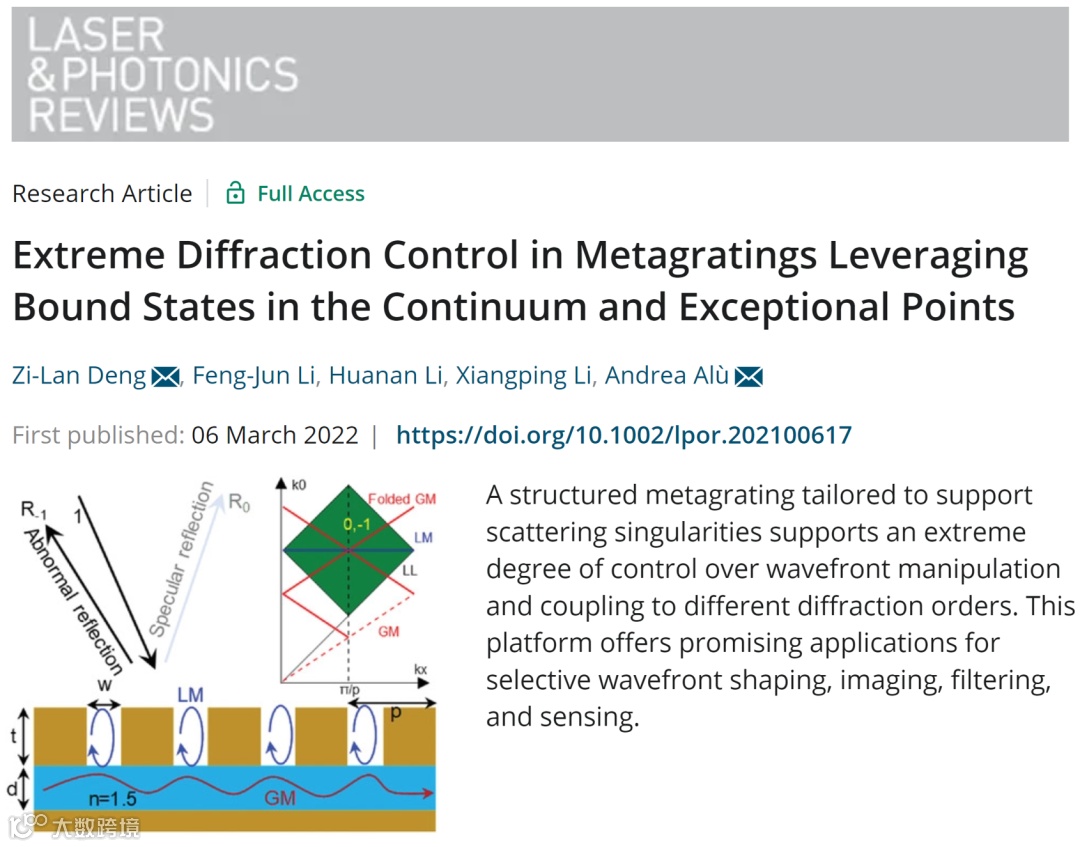相关研究成果以“Extreme Diffraction Control in Metagratings Leveraging Bound States in the Continuum and Exceptional Points”为题发表于国际知名光学期刊《Laser & Photonics Reviews》(DOI: 10.1002/lpor.202100617)上。