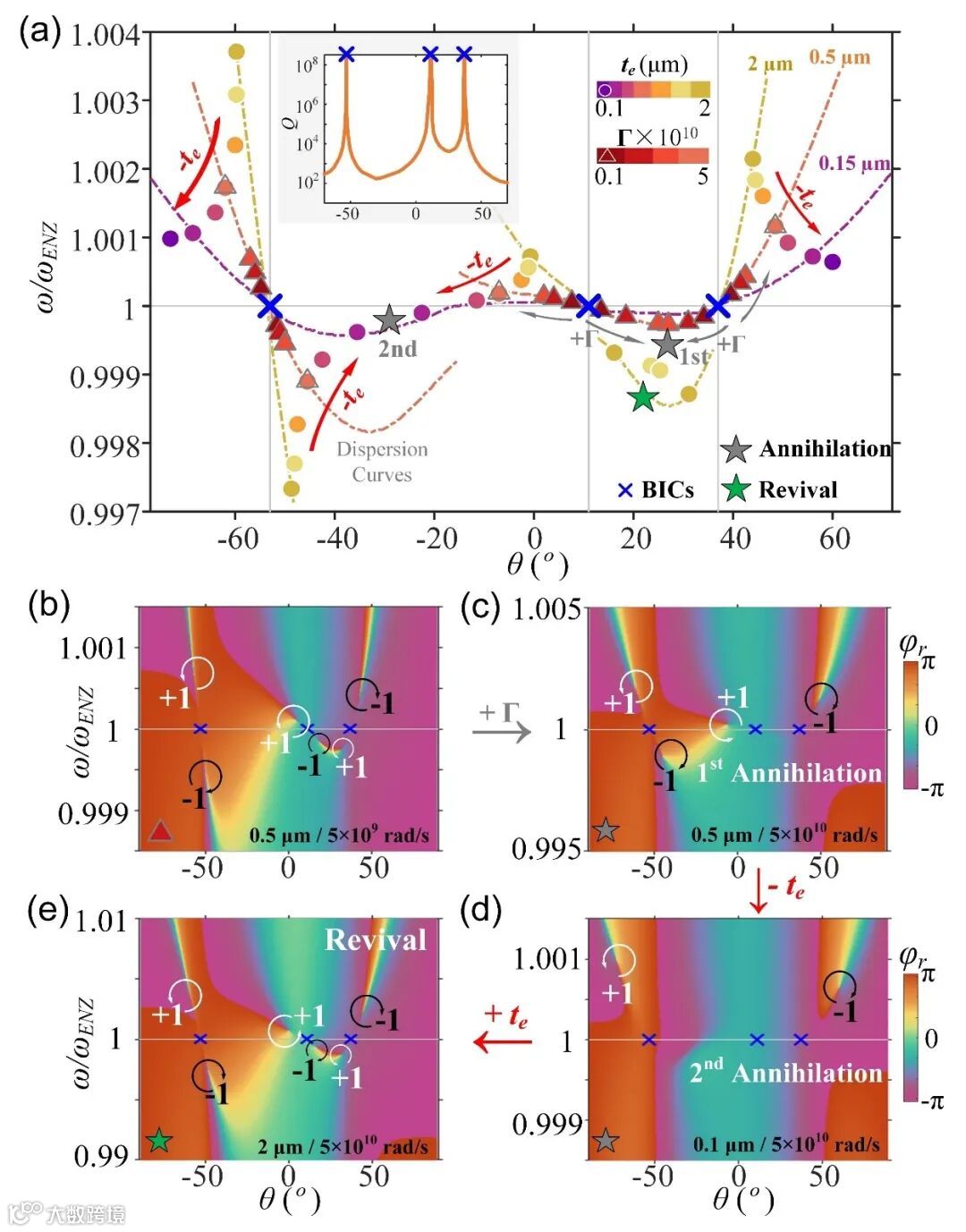 的解近似等于色散方程的极点,从而可以用来定量的判断无损系统中非对称BICs出现的角度位置和数目。当材料引入损耗后,每一个BIC均分裂出2个相反拓扑荷数的相位奇点,通过调控系统中的损耗大小,这些非对称的TPSPs在色散曲线上产生,演化,甚至湮灭。例如,图2研究了由三个非对称BICs分裂产生的TPSPs的演化路径,奇点的湮灭顺序由色散曲线的形状以及Q因子的大小决定。此外,本工作进一步系统地讨论了介电材料的介电常数以及厚度等参数对非对称BICs和TPSPs的产生和演化的影响。
