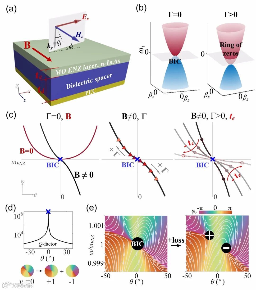 。为了研究该体系下TPSPs的产生机理,我们首先推导了无介电层结构时导模(Berreman modes)的色散。图1(b)-1(e)分别从复频率的虚部、实部、Q因子以及相位图谱对比分析了无损条件下的BIC和加入损耗后产生的TPSP之间的关系。在