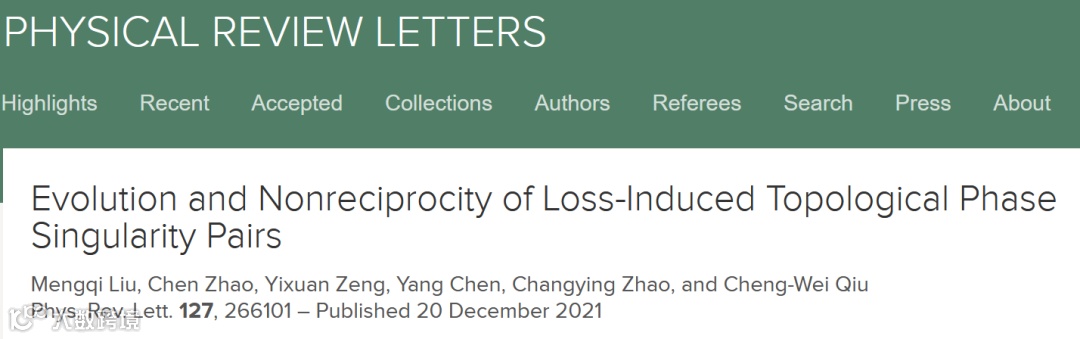 不同于实空间的涡旋光和动量空间的偏振奇点,由损耗诱导的存在于光谱-参数空间的相位奇点作为一类新的拓扑特征被发现。近日,新加坡国立大学仇成伟教授课题组,上海交大赵长颖教授课题组以及湖南大学合作,在非互易体系下,研究了损耗诱导的谱空间拓扑相位奇点的非对称动态演化及其在打破热辐射基尔霍夫定律方面的应用。相关研究成果以“Evolution and nonreciprocity of loss-induced topological phase singularity pairs”为题,发表在Physical Review Letters上(Phys. Rev. Lett. 127, 266101, 2021)。