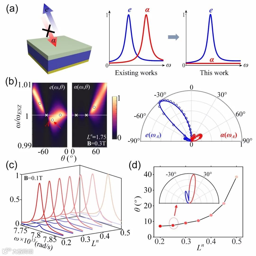 图1 TPSPs的产生机制和非对称调控方法。(a)磁性零介电常数薄膜与介电材料组成的层状结构;(b)无外加磁场时,材料中引入损耗后本征频率虚部的变化;(c)材料损耗(