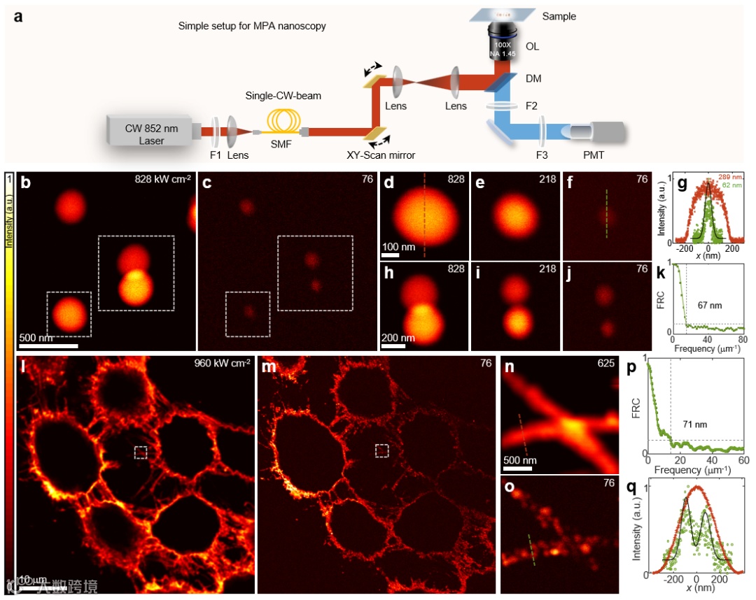 近日,华南师范大学詹求强教授课题组在镱镨共掺的纳米晶体中、室温条件下实现了高效的光子雪崩现象。在物理机理上,提出多离子级联作用的能量迁移光子雪崩(Migrating photon avalanche)新机理,为多种发光离子实现多波段的超高阶非线性荧光发射提供了通用方案,利用此机理在852nm、CW、120 kW/cm2的激光照射下观察到了高效的46阶的非线性荧光发射。在超分辨成像应用上,基于获得的极高阶非线性效益实现了低光强、近红外、单光束的超分辨亚细胞成像,系统无需针孔滤波比传统共聚焦更简单,但分辨率是共聚焦的4倍左右,横向分辨率可达62 nm,而且证明了该技术可应用于免疫标记亚细胞结构的超分辨成像。相关成果以“Migrating photon avalanche in different emitters at the nanoscale enables46th-order optical nonlinearity”为题,发表在《Nature Nanotechnology》上。