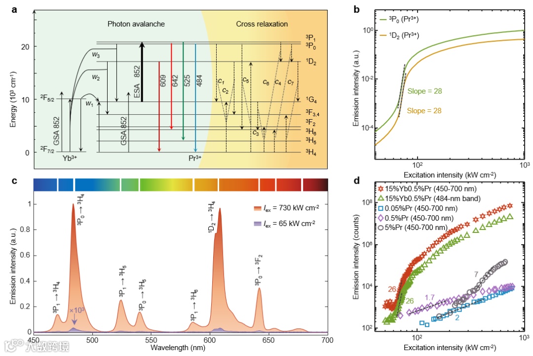 研究者首先通过建立能级模型,使用速率方程模拟验证了理论的可行性,分析各种因素对光子雪崩效应建立的影响机制,探寻确定合适的掺杂组分。随后基于理论结果指导合成相应的纳米晶体结构。在852 nm激发光作用下,测试纳米颗粒的发光强度对激发光强度的响应曲线(功率曲线),镨离子展示出覆盖蓝光至红光多个波段丰富的上转换发光峰,而且每个发光峰的响应曲线在对数坐标系中都呈现出明显的“S”型,即在达到一定功率阈值后(约60 kW/cm2),轻微增加激发光强度将导致荧光强度急剧增加,两者之间表现出超高阶的非线性依赖关系,阶数高达26。