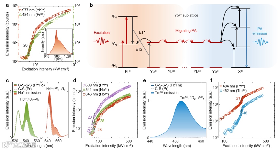 图 2 迁移光子雪崩 (MPA) 理论和实验研究,实现了光子雪崩效应迁移至钬和铥离子,非线性阶数最高达46阶。
