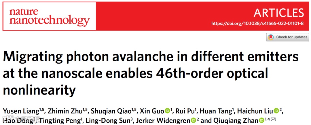 光子雪崩是一种具有高阶非线性响应特点的上转换发光现象,于1979年首次在掺镨晶体中被观察到,表现的特征是当激发光功率超过一定阈值后,发射强度随激发光强度增加而展现出超高阶非线性依赖关系。但过去四十年里大部分光子雪崩现象都只能在块体材料观察到,部分甚至依赖于低温的实验条件。这是因为在纳米尺度下实现光子雪崩存在很大挑战,如纳米颗粒表面能量损耗很大、增强交叉驰豫与浓度猝灭存在矛盾关系、常温下声子弛豫能量耗散大等等。光子雪崩纳米颗粒具有高阶的非线性响应和高效的上转换发光效率,在单光束超分辨成像、传感、微纳激光器等领域展现出巨大的潜在应用。因此,在纳米尺度下实现极高阶的光子雪崩效益长期以来是一个难以克服的重要难题。