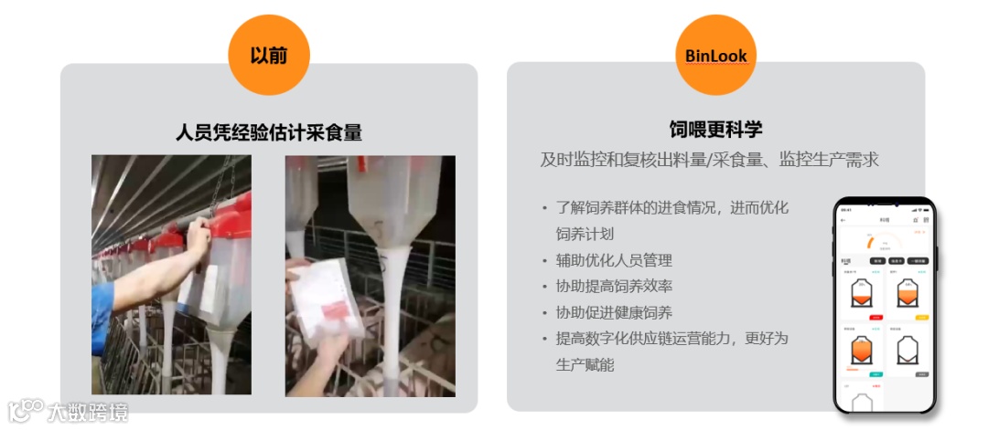 新手段:通过BINLOOK料塔精测机器人及时监控和复核出料/采食量,了解饲养群体的进食情况,进而优化饲养计划,辅助优化管理,协助提高饲养效率,协助促进健康饲养,提高数字化供应链运营能力,更好为生产赋能。