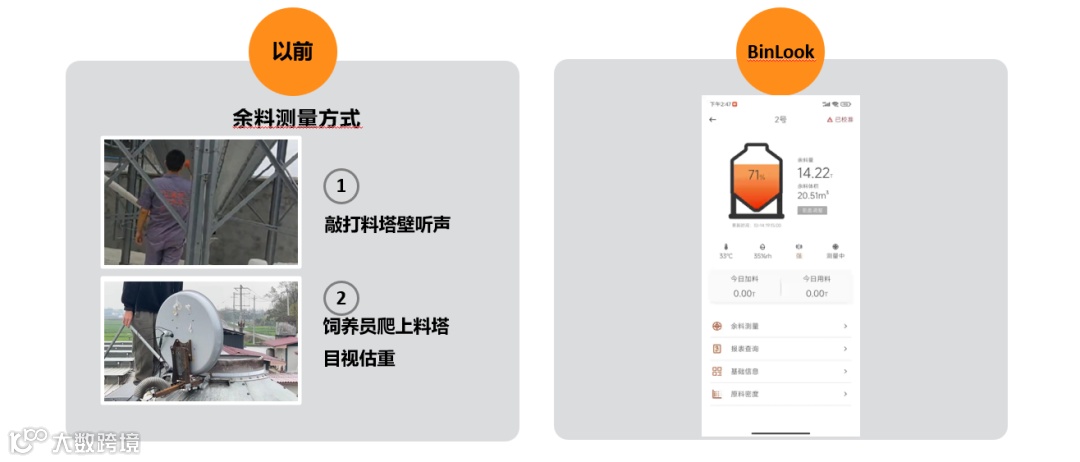 泽牧科技BINLOOK料塔精测机器人 在加料复核、出料/采食量、库存管理、报料计划四大应用场景中,帮助养殖业提供饲料管理智能化解决方案。