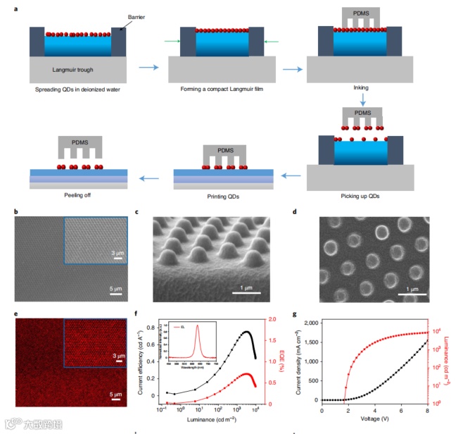 QLED像素图案的实现主要是通过喷墨打印技术、光刻技术和转印印刷技术(TP)来实现的。喷墨打印在生成几微米以下的量子点像素方面面临着巨大的困难。光刻方法产生的量子点像素不可避免地含有光刻胶残留物,阻碍电荷传输,导致器件性能下降;此外,由于技术限制,其尺寸一般超过几微米。相比之下,TP可以用于构建没有有机残留物的超微小像素。目前已经可以通过TP制备全色QLEDs。值得注意的是,之前的高分辨率QLED表现出较低的性能,其外部量子效率(EQE)和亮度明显低于旋转涂层制备的QLED。这可能是由于转移的QD薄膜质量较差,以及空穴传输层(HTL)和电子传输层(ETL)直接接触导致像素之间的非发光区域出现较大的漏电流。