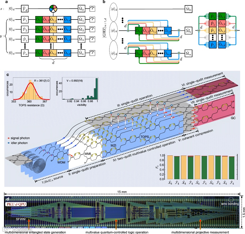 近日,来自北京大学物理学院、介观物理国家重点实验室的Yulin Chi等人报告了一个基于可编程量子计算的硅光子集成电路量子处理器,并展示了它对量子计算并行性的增强。该处理器将两个量子夸脱(ququart)态和多值量子控制逻辑门的初始化、操作和测量的所有关键功能和能力集成在一起,具有高水平的保真度。通过重新编程处理器的配置,他们实现了最基本的量子傅里叶变换算法,所有算法都是四进制的,以使用qudit对量子并行性的增强进行基准测试,其中包括广义Deutsch-Jozsa和Bernstein-Vazirani算法、四进制相位估计和快速因式分解算法。单片集成和高可编程性允许在处理器中实现100多万个高保真的qudit状态准备、操作和投影。他们的工作展示了一种集成的光子量子技术,用于基于qudit的量子计算,具有更高的容量、准确性和效率,这可能会加速构建大规模量子计算机。相关研究工作发表在《Nature Communications》上。(詹若男)