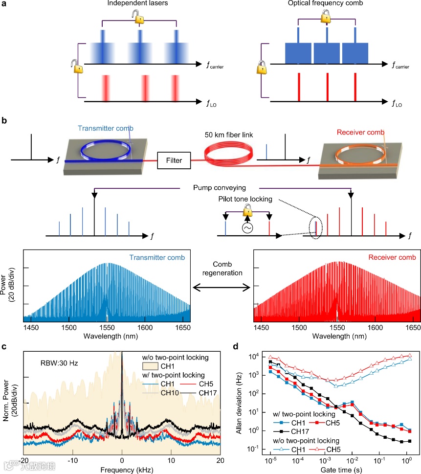 耗散Kerr孤子微梳是一种很有前途的多波长光纤通信激光光源,其梳状线的频率和相位稳定性远远超过了独立激光器。特别是,对于相干光通信,一个非常有益但很少被探索的目标是重新生成Kerr孤子微梳作为接收器本地振荡器,以保持输入数据载波的频率和相位特性,从而以最小的光学和电气补偿实现相干检测。