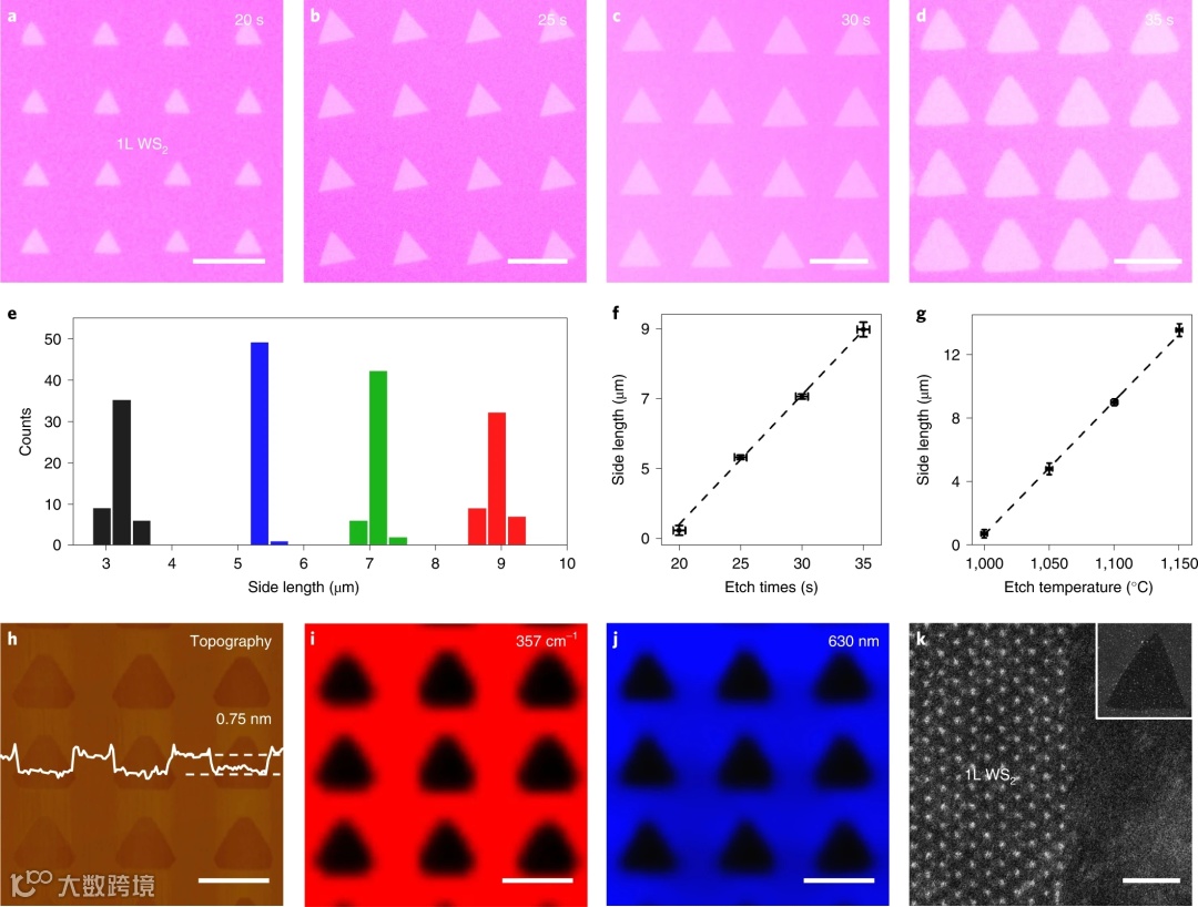 3、采用 20 s、25 s、30 s 和 35 s刻蚀得到的三角形孔的平均边长分别为3.2、5.3、7.1和9.0 μm,标准偏差分别为0.14、0.06、0.07和0.21 μm(图2e)。标准偏差基本上低于光学显微镜研究的测量误差,表明蚀刻过程高度均匀。边缘长度与时间呈线性关系,平均蚀刻速率为~0.38 μm s-1(图2f);蚀刻速率也可以通过蚀刻温度进行调整(图2g),展示了高度稳健和可控的蚀刻过程。