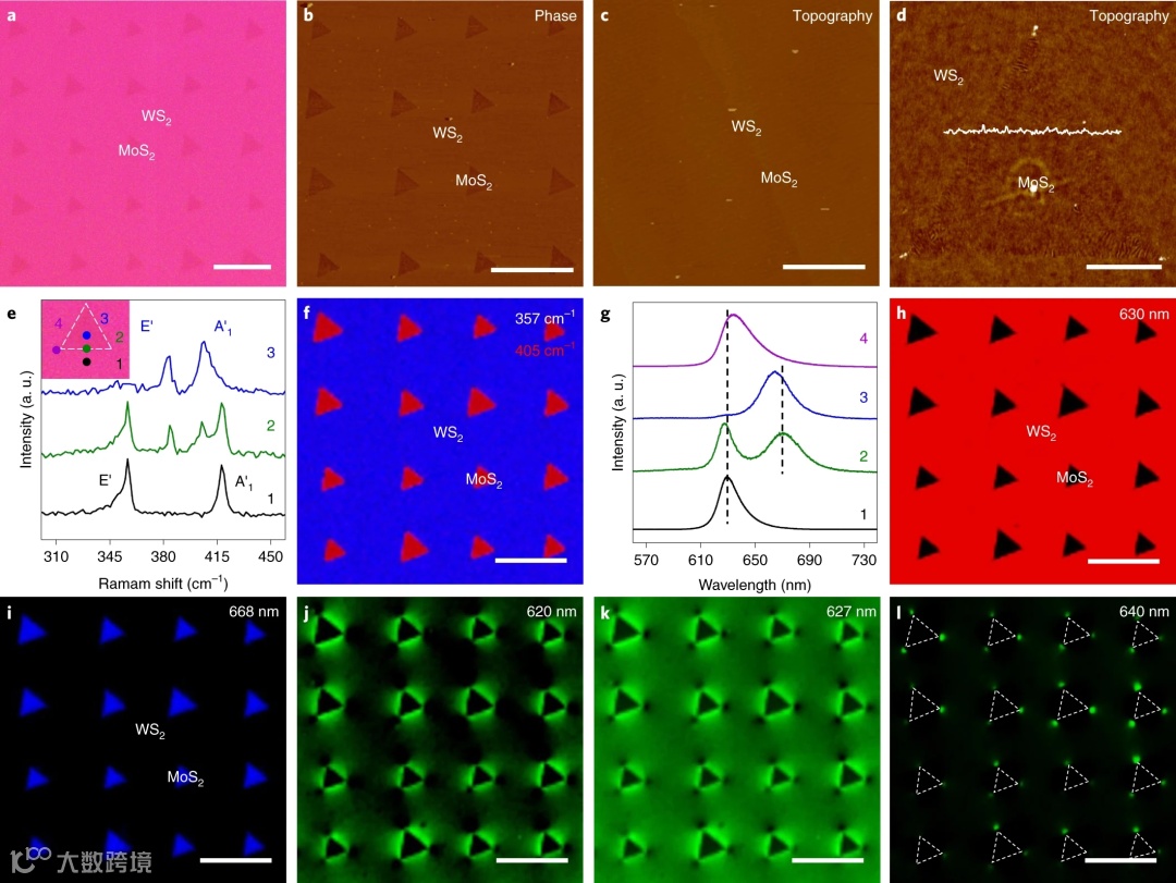 1、选择性图案化和内外延生长方法可以很容易地扩展到其他MMH的生长。为此,本工作还制备了单层WS2-MoS2镶嵌异质结构。WS2-MoS2异质结构的光学显微镜图像显示在WS2基质(亮对比度)中MoS2域(暗对比度)的共存(图4a)。