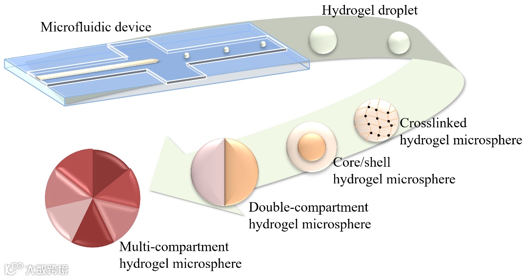 介绍了水凝胶微球材料相对于宏观凝胶的优越性,并强调了微流控技术相比传统方法在制备水凝胶微球上的优势。例如,传统的乳液搅拌法得到的水凝胶微球往往高度分散,批次重复性较差;光刻法生产的水凝胶微球产量过低。微流控技术可以连续、可重复地制备尺寸均一的微球,相比于只能制造单一组分的水凝胶微球的传统方法,通过扩展微流控装置的功能,可以制备出多重结构的复合微球。