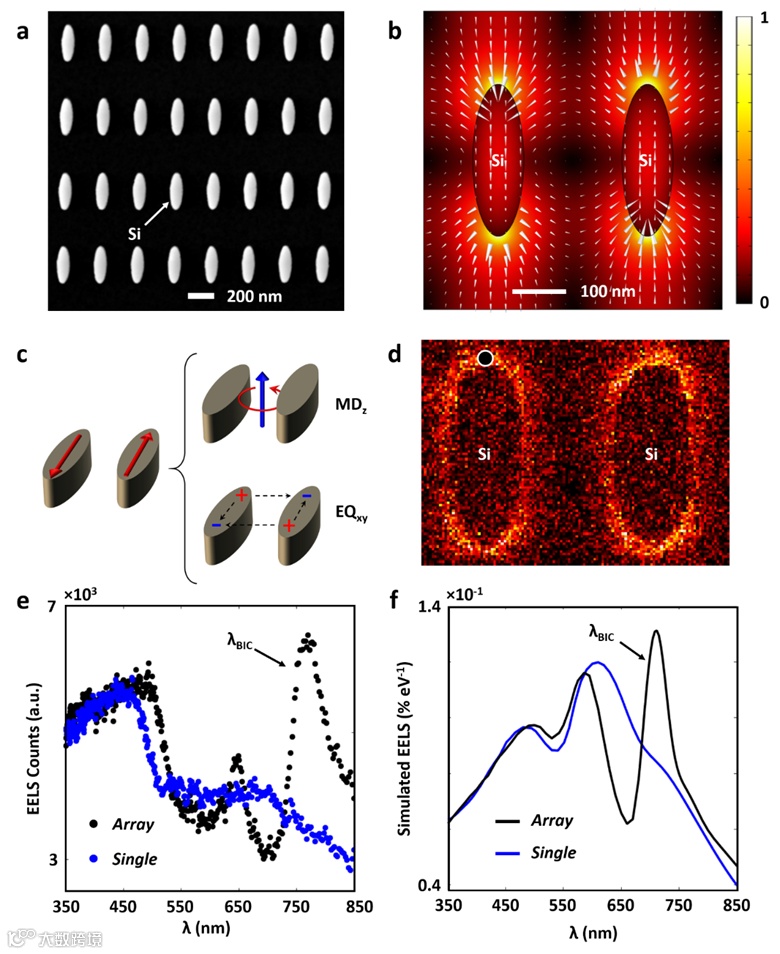图2是通过电子能量损失光谱法探测的“真正的”BIC共振模式。图2(a)是硅纳米天线阵列的STEM环形暗场图像,其中椭圆柱以倾角90°对齐;图2(b)是“真实”BIC模式的模拟近场模式,箭头表示电场方向,其长度与振幅成正比;图2(c)是包含“真实”BIC模式的多极矩示意图;椭圆圆柱纳米天线阵列的实验EELS图如图2(d)所示,可以看出其具有“真实”BIC模式;图2(e)是在椭圆尖端附近的位置测量的EELS光谱,证明了“真实”BIC模式的激发。对于基准测试,从相同尺寸的单个天线元件测量的EELS频谱清楚地显示了与BIC模式相关的缺失峰值。在图2(f)中,黑色的纳米天线阵列的模拟EELS光谱显示BIC共振,蓝色的单个天线元件的光谱显示无BIC共振。