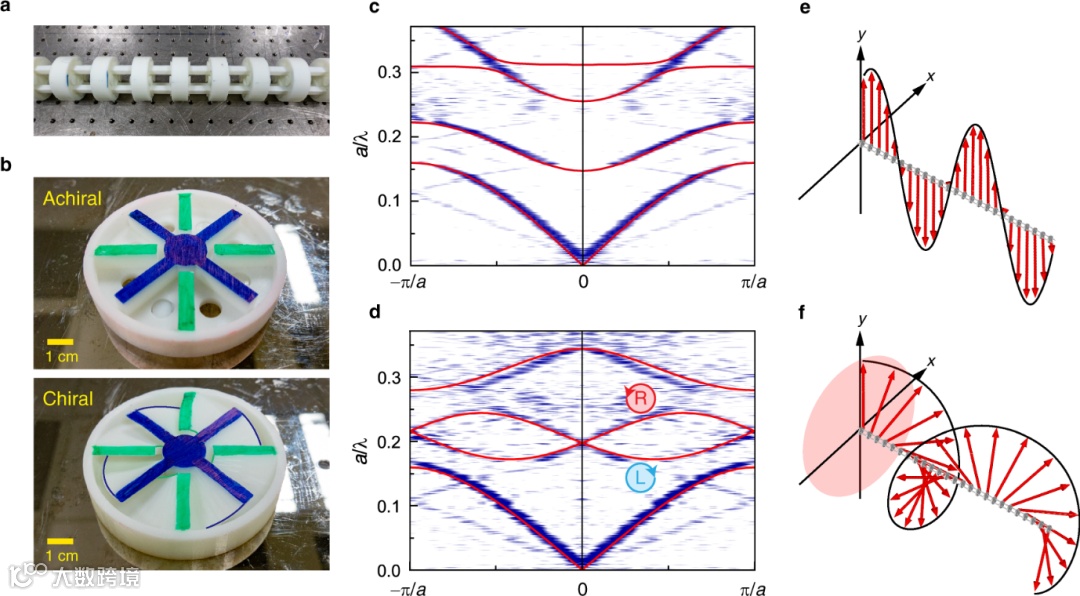 研究团队从构造横向振动的偶极子开始,设计了一种由硬边界构成的亚波长共振腔, 其内部为空气填充,如图1(a,c)所示。非手性共振腔在共振频率下产生对应一对简并的线偏振偶极子,手性共振腔产生一对手性相反的圆偏振偶极子。由这样的共振腔构成的一维阵列(图2(a))其能带结构如图2(c,d)所示,非手性阵列第二条能带对应简并的偶极模式,手性阵列由于空间对称性的破坏而呈现非简并的偶极能带。图2(e,f)展示了非手性和手性阵列中的声波速度场,分别呈现出线偏振和圆偏振的横向声波,即声横波。