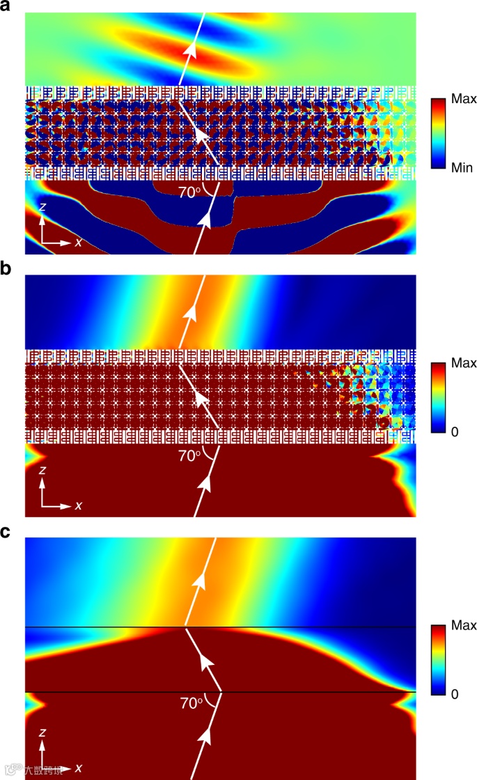 图4. 动量空间声横波自旋轨道相互作用导致的负折射现象(a,b为超材料,c为等效介质)