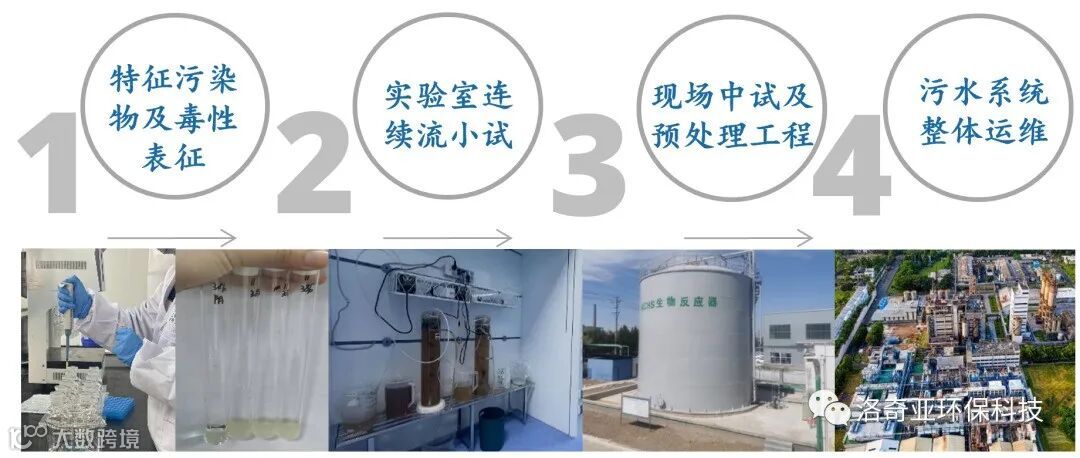 洛奇亚为企业打造全流程服务,通过特征污染物及毒性表征、定向筛菌、实验室连续流小试、现场中试及预处理工程四大阶段,为不同客户企业的特征废水量身定制适合的菌种配置方案。