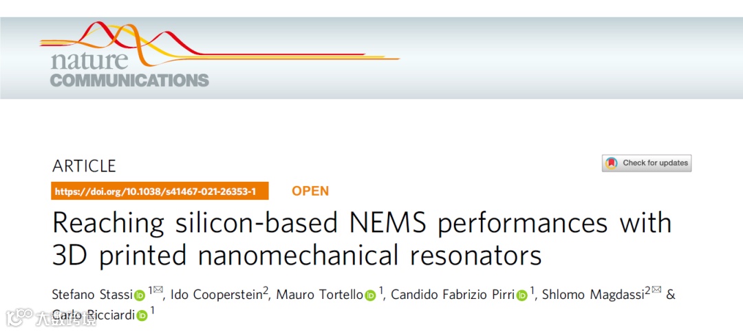 Stassi, S., Cooperstein, I., Tortello, M. et al. Reaching silicon-based NEMS performances with 3D printed nanomechanical resonators. Nat Commun 12, 6080 (2021).