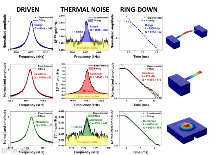 membrane (lower panel) devices extracted with three different approaches: driven the resonator to resonance, thermomechanical motion, and ring-down.
