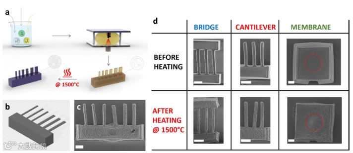 Fig. 2 Scheme of the fabrication process and images of the printed NEMS devices. a Scheme of the fabrication process starting from the precursor solution preparation, followed by TPP printing to photopolymerize locally the solution, structure washing, and final heating step to remove organic content and achieve densification and crystallization. b CAD scheme and c SEM image of a chip composed of six cantilevers of two different widths. d Images of the bridge, cantilever, and membrane devices before and after the heating step at 1500°C. All the scale bars correspond to 10 µm.