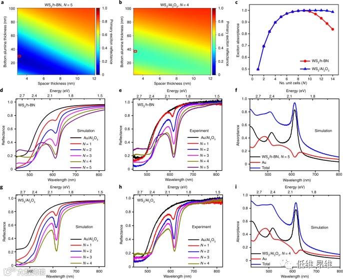 使用双变量优化方案,确定超晶格样品中各个层的所需厚度。优化的目标是最大化(最小化)激子共振的窄带吸收(反射)。对四种不同的超晶格(WS2/h-BN、WS2/Al2O3、MoS2/Al2O3和MoSe2/Al2O3)进行了建模和优化,其中晶胞数量从N=1到8。研究发现,对于基于Al2O3和h-BN间隔的超晶格,在高达N=4和N=5时,吸收明显增强,如图2所示。建模和优化确定了用于最大化(最小化)激子共振吸收(反射)的超晶格几何参数的三个关键设计特征。它们是:(1)晶胞中间隔层的厚度必须尽可能低(图2a和b);(2)随着晶胞数量N增加,底部Al2O3厚度应减小;(3)峰值吸收(在激子共振下)随着N增加接近统一,然后再次下降,表明完美吸收的最佳晶胞数N(图2d-i)。注意到这个最佳N可以随间隔层指数和厚度而变化。鉴于两个TMDCs层之间的电子相互作用在1-1.5nm的间隔层厚度下是不可忽略的,因此在保持电子隔离的同时进一步改进光俘获的空间很小。