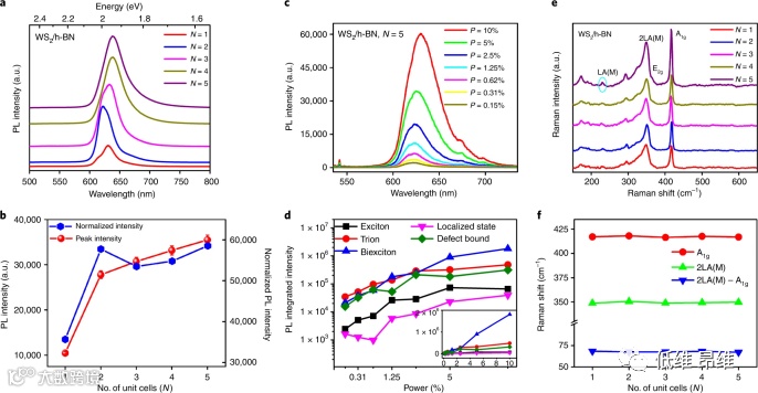 图3. 单层性质的保留。(a)多层超晶格的室温PL光谱随WS2/h-BN超晶格(N=5)晶胞数量增加的变化。(b)对应的PL峰强度和吸收归一化的PL与晶胞数的关系,显示PL强度随着晶胞数量增加而增加。(c)WS2/h-BN,N=5超晶格功率相关的PL光谱。(d)各种激子分量的PL峰强度。(e)同一多层超晶格的拉曼光谱。(f)不变的特征拉曼峰位置。
