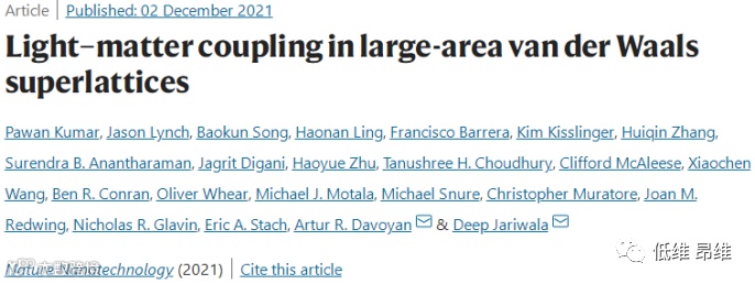 有鉴于此,近日,美国宾夕法尼亚大学Deep Jariwala和加州大学洛杉矶分校Artur R. Davoyan(共同通讯作者)等合作展示了超晶格结构中的光色散工程,该超晶格结构包括2D激子硫族化合物和介电绝缘体的交替层。通过仔细设计晶胞参数,室温下在小于4 nm的有源层激子吸收介质中证明了大于90%的窄带吸收,同时在平方厘米样品中增强了光致发光。这些超晶格显示出强光-物质耦合和激子-极化激元形成的证据,具有几何可调的耦合常数。本文的研究结果展示具有工程化光学性质的概念结构验证,并为从原子级薄层设计可扩展的光学超材料铺平了道路。文章以“Light–matter coupling in large-area van der Waals superlattices”为题发表在顶级期刊Nature Nanotechnology上。