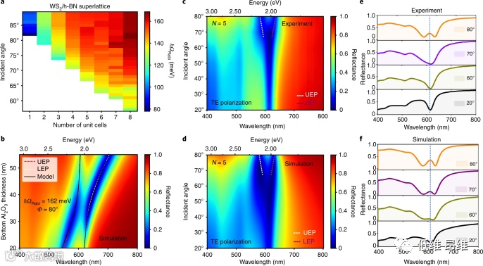 图4. 无图案化多层超晶格中激子极化激元的观察。(a&b)模拟的Rabi分裂对入射角和晶胞数量的依赖性显示了在入射角Φ为80°时反射光谱对底部Al2O3层厚度的依赖性,这显示了激子极化激元的特征反交叉行为。(c&d)实验和模拟的反射光谱的3D彩色成像。(e&f)实验和模拟的反射光谱,显示了从60°角开始的激子-极化激元分裂。