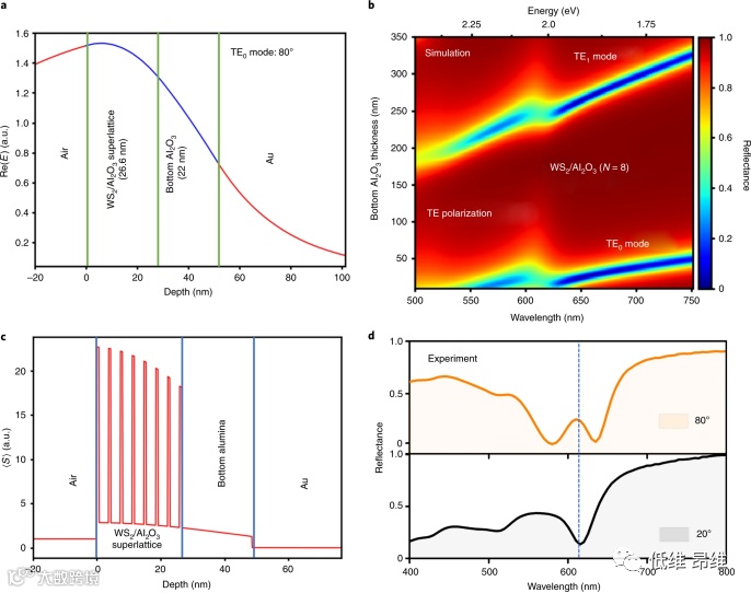 图5. 多层超晶格内的波导表征。(a)底部Al2O3厚度为22 nm(λ=642 nm)时TE0模式的电场分布,其中蓝线表示WS2/Al2O3区域,而红线表示空气和Au区域。(b)WS2/Al2O3,N=8堆叠中反射率对底部Al2O3厚度和波长的依赖性。(c)时间平均的坡印廷矢量分布,表明入射光的能量集中在吸收WS2层内。(d)TE偏振光下80°和20°入射角的实验反射光谱。