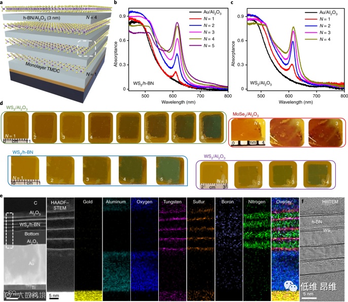 本文采用高度可扩展的方法来制造vdW MQWs和超晶格结构。使用MOCVD技术生长的WS2和MoS2单层的晶圆级样品和使用硼嗪前驱体通过CVD生长的h-BN用于样品制造。在这项工作中采用并展示了两种不同类型的结构,如图1a所示:(1)由TMDCs和h-BN交替层组成的全vdW超晶格,以及(2)具有TMDCs和ALD生长的3D绝缘氧化物交替层的混维超晶格。在这项工作中主要研究的全vdW超晶格包括单层WS2作为激子层,绝缘h-BN(3nm)作为间隔层,在Al2O3/Au衬底的顶部重复。在TMDCs-氧化物超晶格中,h-BN层被Al2O3层取代。本文提出的概念和制造方案是通用的,并已扩展到单层WS2、MoS2和少层MoSe2作为激子介质。通过2D硫族化合物和h-BN层的湿法转移来制备超晶格结构。在实验测量的吸收光谱(图1b和c)和宏观照片(图1d)中可以看出随着晶胞数量增加,超晶格的吸收增强。WS2基超晶格从N=1的近透明薄膜转变为N=5的深绿色,其中N是晶胞数。这些超晶格的大面积(cm2)实现是本研究中一个特别重要的演示,因为2D TMDCs在光子学/光电子学中的任何实际应用都需要大面积、均匀的材料。原则上,所有材料和工艺都是晶圆可扩展的。虽然已经报道了TMDCs在h-BN上的直接生长,但尚未实现这种多层氮化物/硫族化合物vdW超晶格的可扩展生长。
