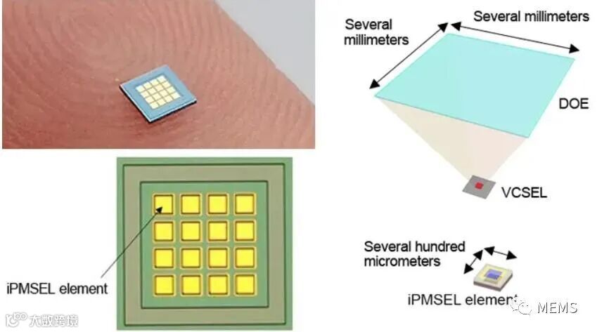 左图:iPMSEL阵列由16个发光单元组成。右图:由VCSEL、DOE和iPMSEL阵列组成的光束模式光源概念图。