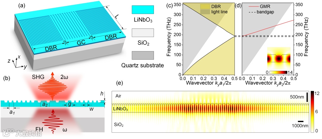 图1 (a)LNOI导波模谐振器的结构示意图;(b)背面泵浦及SHG信号产生示意图;(c)一维DBR能带结构与(d)导波模谐振的色散特性;(e)导波模谐振模场分布。