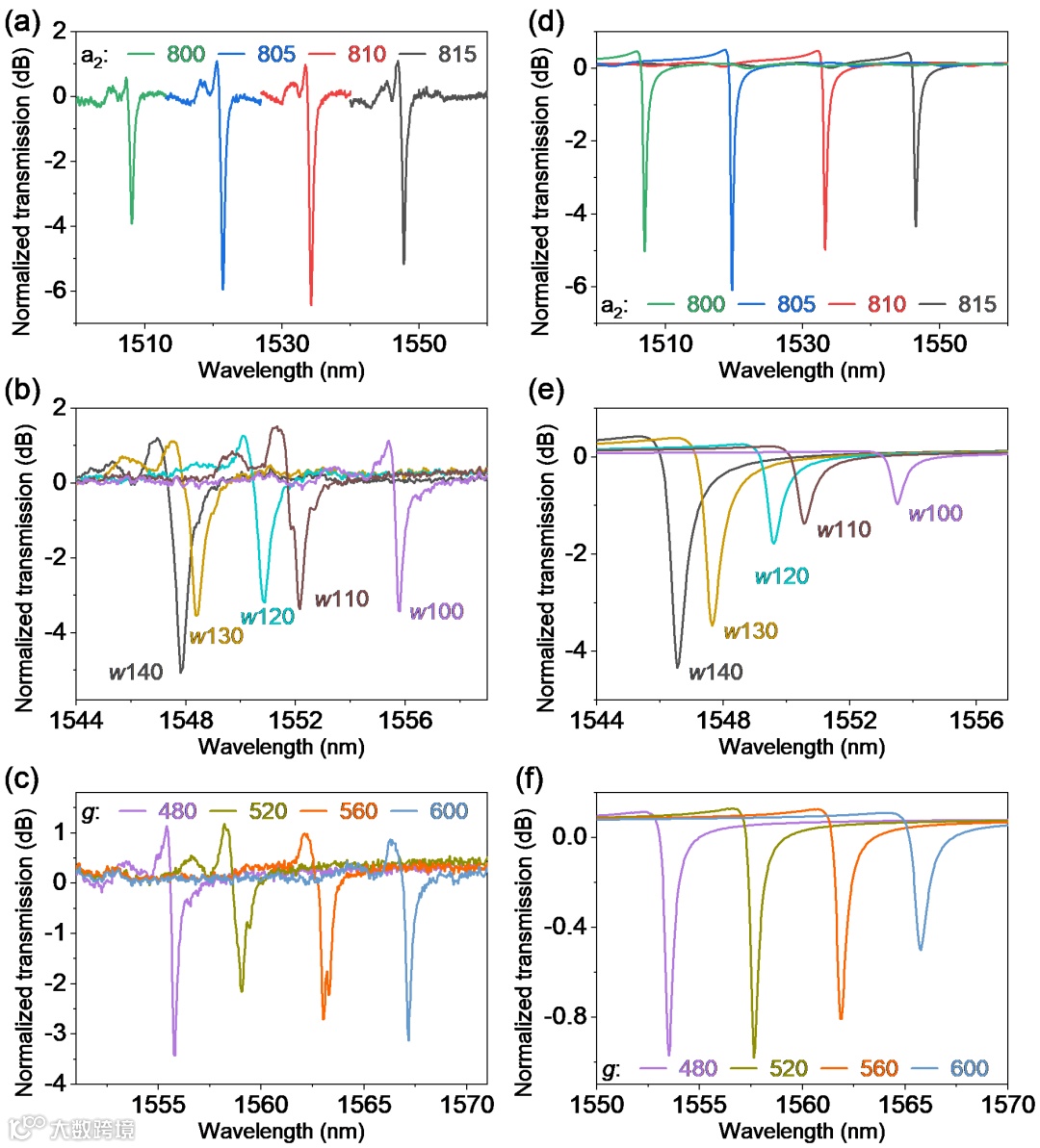利用电子束曝光和感应耦合等离子体刻蚀等工艺,研究人员成功制备了高质量的LNOI导波模谐振器,器件的扫描电子显微镜图如图2中所示。搭建透射光路测试系统对所制备的一系列器件进行测试,并与时域有限差分仿真结果对比,两者能够较好吻合,如图3(a-f)所示。