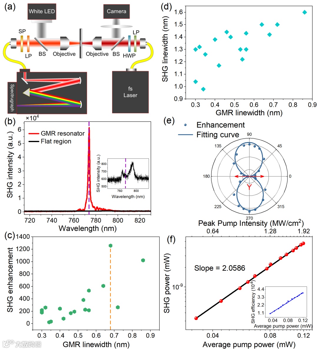 图4 (a)倍频光测试系统示意图;(b)测试得到的二倍频光谱;(c)二倍频增强倍数随器件线宽的变化;(d)二倍频线宽随器件谐振峰线宽的变化;(e)倍频光增强倍数与偏振的关系;(f)倍频光强度随泵浦功率的变化