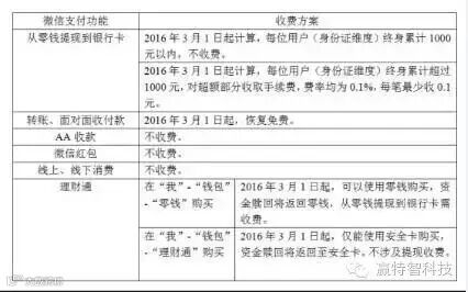 2月15日,微信支付正式公布,自2016年3月1日起,每位用户享有共1000元的免费体现额度,超出之后,则按现金的0.1%收取手续费;理财通转银行不收取;微信红包、AA收款等继续免手续费。