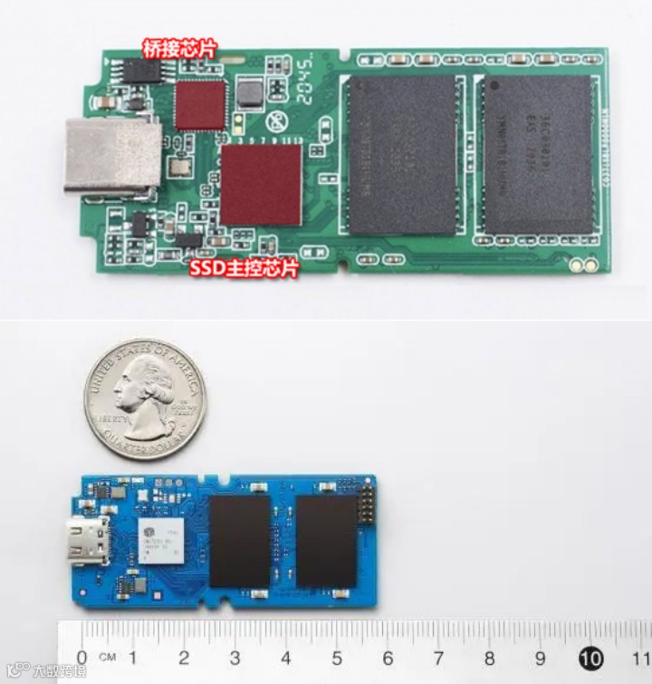 第一,体型更加小巧。目前市面上有很多PSSD都采用主控+桥接芯片组合的PCB主板,其作用式可以将NAND与Type-C接口做连接。
