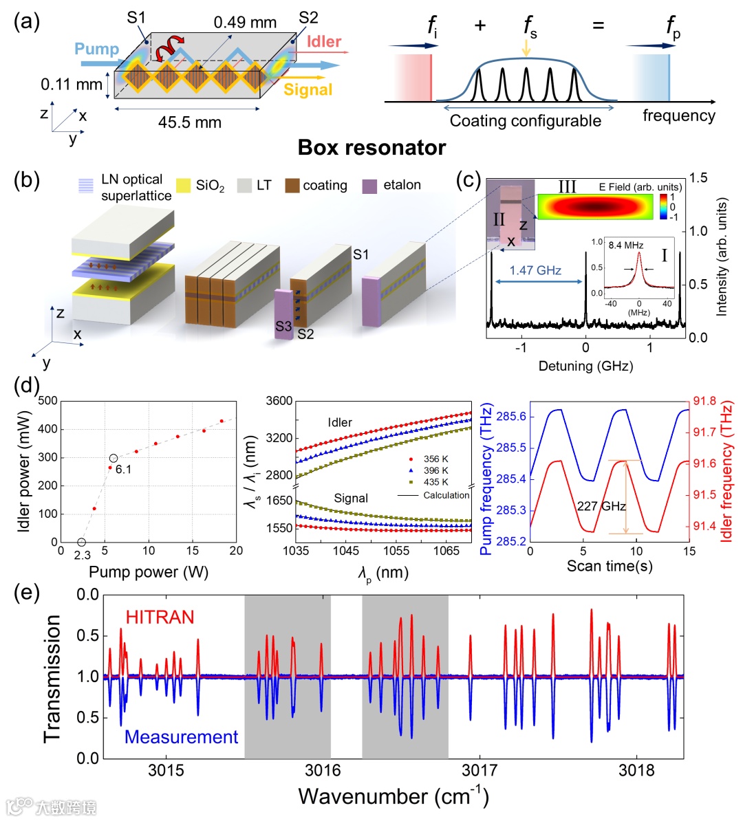 图(a-c)展示了铌酸锂介电超晶格盒形微腔的设计、制备和表征。盒形微腔采用法布里帕罗光腔结构,因此可以通过改变端面膜系来自由选择共振波长,实现中红外闲频光随近红外泵浦激光的快速连续调谐。铌酸锂介电超晶格材料以上下两层折射率略低的钽酸锂作为衬底,形成大模场波导结构,避免了在一般体块材料中的衍射损耗。精密机械抛光保证了盒形微腔侧壁具有纳米级别的粗糙度,降低了光在微腔中的传输损耗,实现了接近铌酸锂材料吸收极限的品质因子和较低的振荡阈值。图(d)展示了盒形微腔光参量振荡的功率调谐和波长调谐,中红外激光输出功率最高可达0.43W,波长粗调谐范围超过600nm,无跳模调谐范围达227GHz。图(e)展示了低压甲烷中红外波段吸收谱线的测量结果,测量范围达3.7cm-1,吸收峰频率准确度方差达0.97 MHz,实现了快速、高精度的测量。