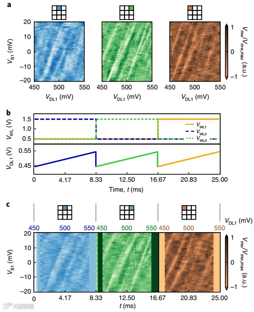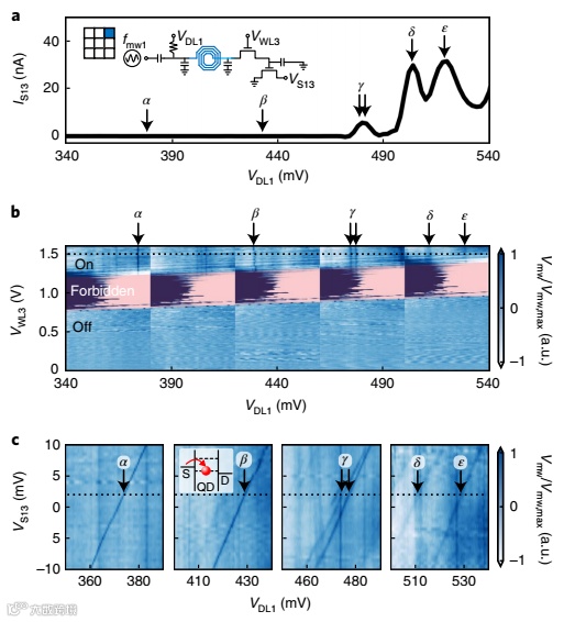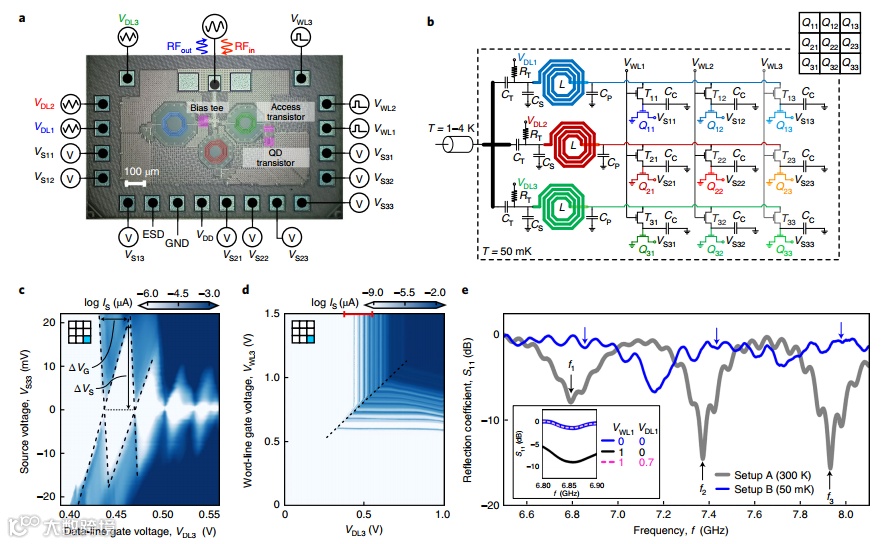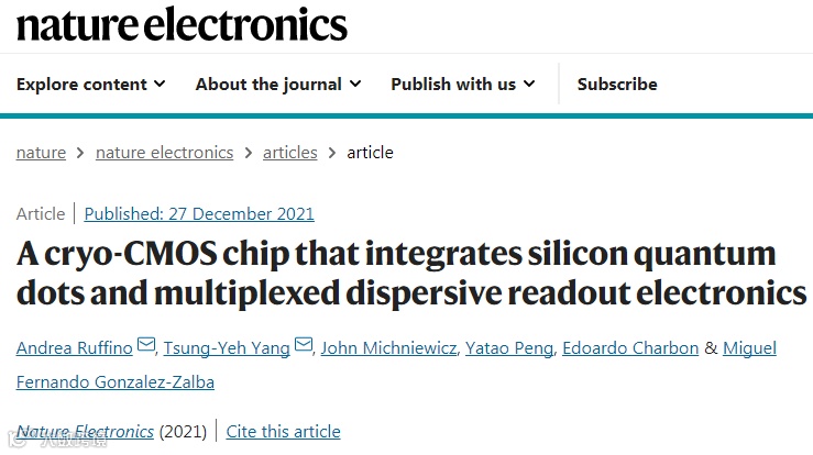 近日,瑞士洛桑联邦理工学院Andrea Ruffino,日立剑桥实验室Tsung-Yeh Yang在Nature Electronics上发文,报道了一种使用40nm CMOS技术制造的Millikelvin集成电路,该集成电路将硅量子点阵列与支持电子设备集成在一个架构中,该架构允许该阵列被有效地寻址和读取。该架构包含集成微波集总元件谐振器,用于分散感测量子点的电荷状态,通过列-行寻址分布中的数字晶体管进行调节。通过该芯片,演示了组合的时分和频分多路复用,可以次线性地扩展读出所需的资源和占用空间。