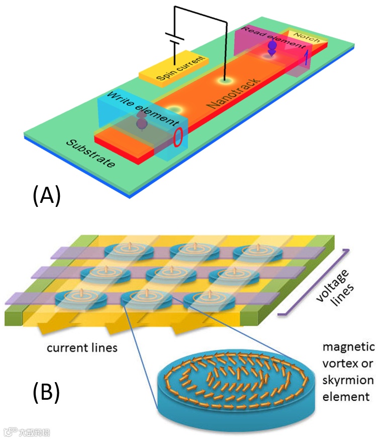 图 7. 物理人设计和构造的众多器件应用之两个:(A) 磁斯格明子赛道存储器。(B) 磁斯格明子作为存取单元的读写存储器。这些结构都可以用最简单的三明治结构来阐述其中原理。