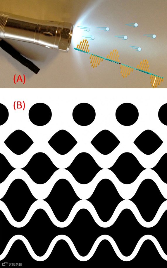 图 1. (A) 普通人视觉中的波粒二象性 (wave - particle duality):手电筒发出的光,既是光子 (粒子),也是波 (电磁波)。但它们在我们眼中是一回事。(B) 艺术家笔下的波粒二象性。决定于观察者的视觉和心理学感受,您可能看到的是上方的粒子 (黑色) 和白色的环境真空。您也可能是看到了下方的波动 (白色) 和黑色的环境真空。毫无疑问,艺术家比我们物理人更擅长表达这种 duality 的意象。