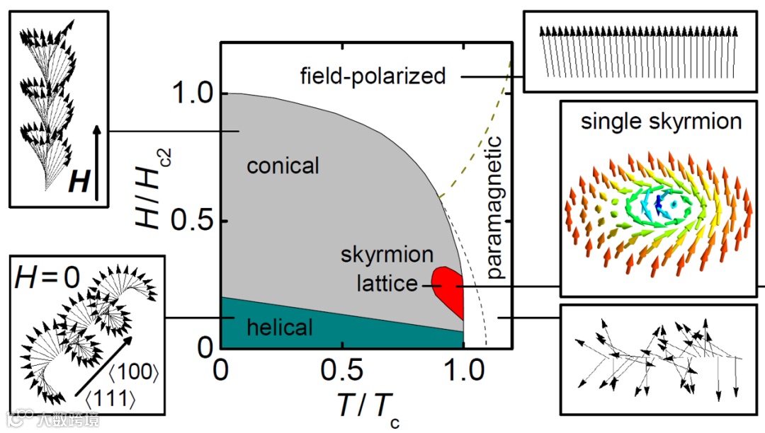 图 6. 典型的磁斯格明子在温度 T 和磁场 H 组成之平面中相图 (T – H 相图)。图中红色区域为磁斯格明子稳定存在的区域,它刚刚好在磁相变点的下侧。图中也展示了相图区中各种其它磁结构的空间特征。