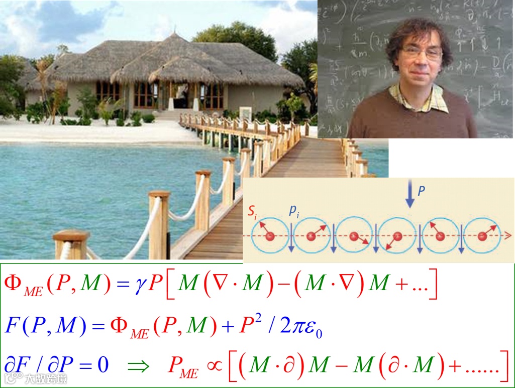 这篇工作的作者之一,即马克西姆 • 莫斯托沃伊 (Maxim Mostovoy),对很多凝聚态物理人来说并不陌生。他就是那位在 2005 年提出第 II 类多铁性磁电耦合唯象理论的那位学者。马克西姆的外貌平和而普通,但那种典型欧洲物理人的“随意”、“不修边幅”和“少言寡语”的特征十分突出。他极富创意提出的那个磁电耦合自由能项,如图 9 所示,让我们这些拘泥于朗道磁电耦合理论框框中的人们茅塞顿开、豁然开朗。笔者曾经多次用图 9 的卡通图来表达对马克西姆的敬意:他是一个能让我们偶尔“面朝大海而春暖花开的”物理人。