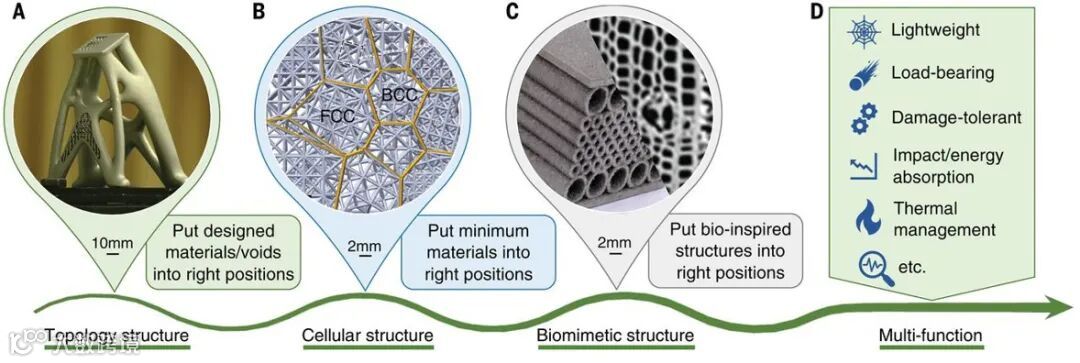 其二是“独特结构打印创成独特功能”,揭示了拓扑优化结构、点阵结构、仿生结构增材制造的本质是分别将优化设计的材料及孔隙、最少的材料、天然优化的结构打印至构件内最合适的位置,提出了基于上述三类典型结构创新设计,以及增材制造实现轻量化、承载、减震吸能、隔热防热等多功能化的原理、方法、挑战及对策。